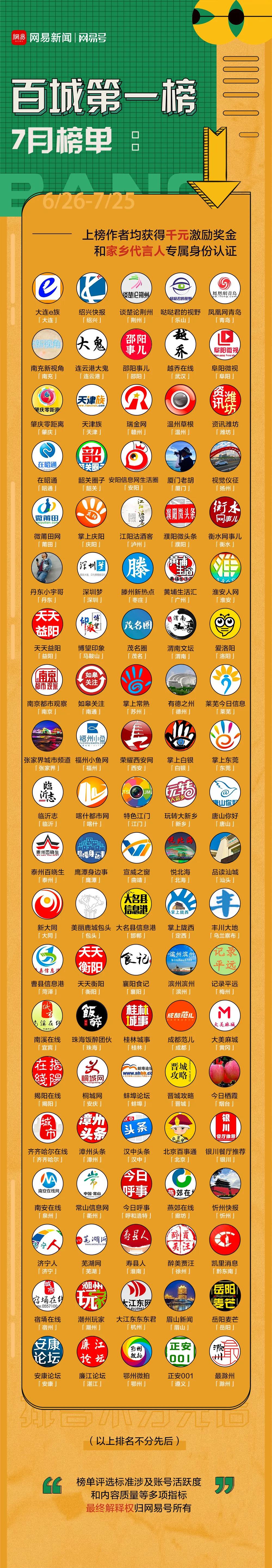 以下為7月“百城第一榜”完整榜單: