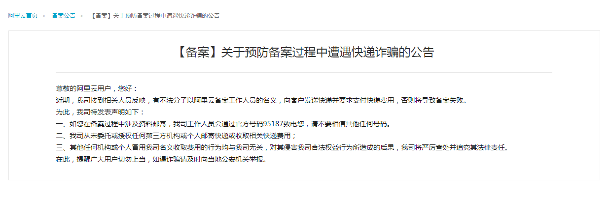 阿里云【備案】關(guān)于預(yù)防備案過(guò)程中遭遇快遞詐騙的公告