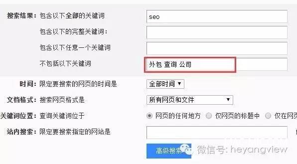 我們可以利用高級搜索工具對搜索結(jié)果頁面進行篩選,比如我們查詢“seo”關(guān)鍵詞,但是我們不想看出現(xiàn)seo外包,seo公司,seo查詢這一類的網(wǎng)站的,此時我們就可以在,限制關(guān)鍵詞中添加“外包 查詢 公司”即可;
