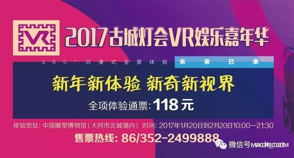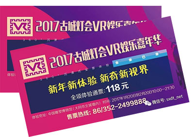 即日起至2月20日,通過“大同市和陽學(xué)堂”或“新大同”微信公眾平臺購買VR門票的觀眾,將獲得價值118元的VR嘉年華門票+價值30元的2017中國大同古都燈會門票各一張。在線購票后以每天現(xiàn)場登記入場順序為準(zhǔn),先到先得,每天幸運名額30名。