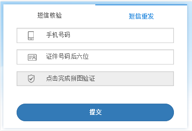 3.3、依次填寫驗(yàn)證信息(驗(yàn)證碼、手機(jī)號(hào)碼、證件號(hào)碼后六位)并完成圖形驗(yàn)證,點(diǎn)擊【提交】按鈕。(證件號(hào)碼后六位指身份證號(hào)碼)